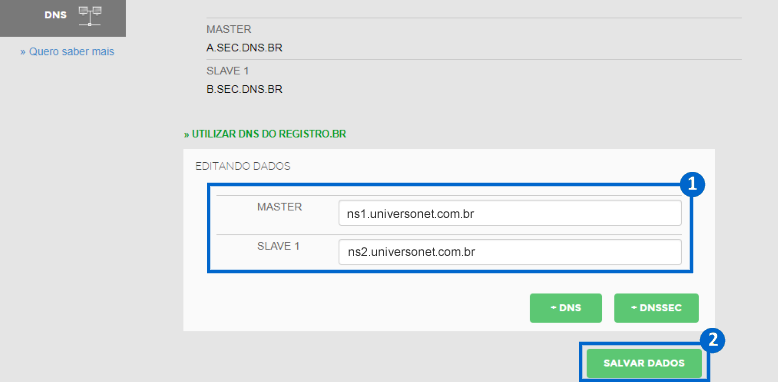 Nos campos Master e Slave 1, adicione os DNS da sua hospedagem na UniversoNet, os dados foram enviados para seu e-mail de cadastro.